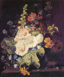 Hollyhocks and Other Flowers in a Vase - Jan van Huysum