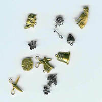 A variety of brass, antique gold and antique silver charms. Examples include: